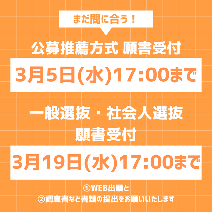 まだ間に合います!願書受付中学校推薦型選抜B(公募推薦方式)・一般選抜・社会人選抜の出願は3月まで受け付けております。各選抜方法により、出願資格や選考方法が異なりますので、募集要項をご確認ください。