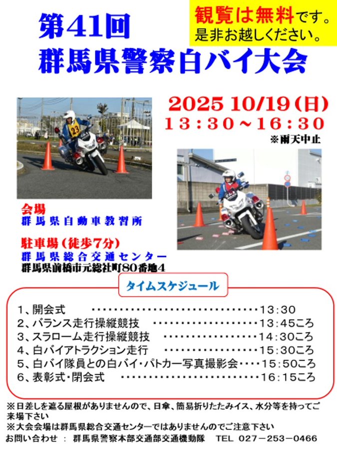 【第41回群馬県警察白バイ安全運転競技大会のお知らせ】白バイ隊員による高度な運転技術を披露する競技大会。白バイによるアトラクションや自由に撮影できる撮影会も行います。観覧は無料です。日時:10月19日..