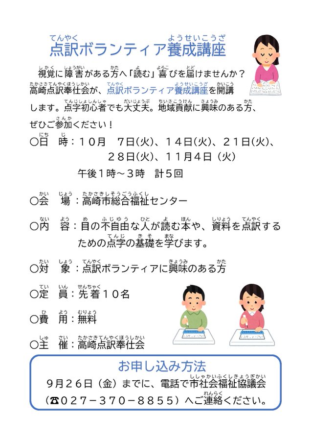 【点訳ボランティア養成講座】点字を学び、視覚に障害がある方へ「読む」喜びを届けませんか?○日時:令和7年10月7日(火)~11月4日(全5回)13:00~15:00○会場:高崎市総合福祉センター○費用..