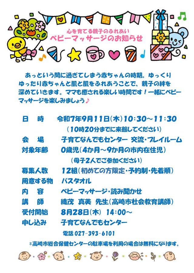 【ベビーマッサージのお知らせ】9月のベビーマッサージ予約枠に若干の空きがあります。○日時=9月11日(木)10時30分~11時30分○会場=子育てなんでもセンター交流・プレイルーム【子育てなんでもセン..