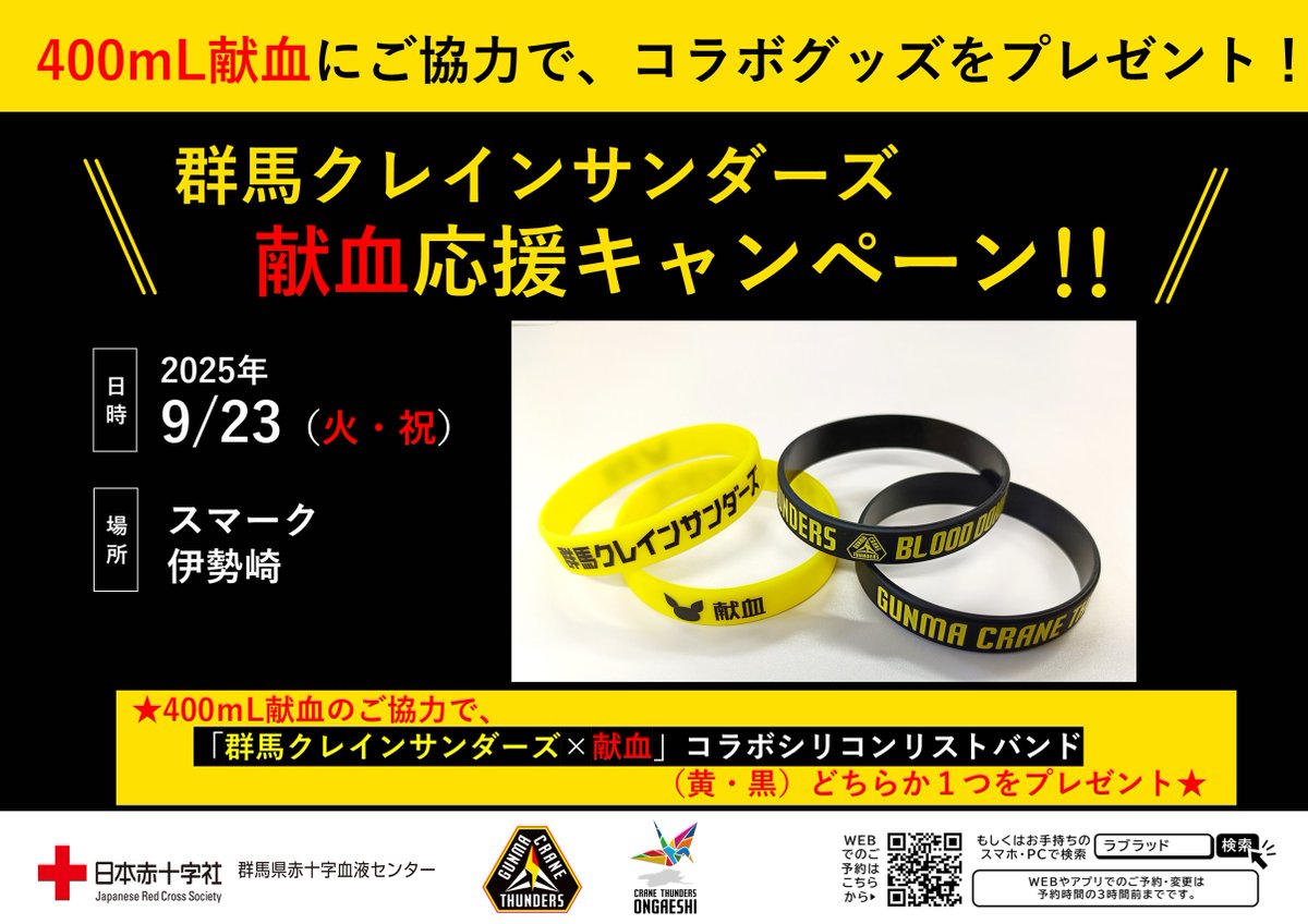 \9/23(火・祝)スマーク伊勢崎限定/#スマーク伊勢崎で行われる#群馬クレインサンダーズの応援イベントに#献血バスも参加します400mL献血にご協力いただいた方にサンダーズコラボ『シリコンリストバン..