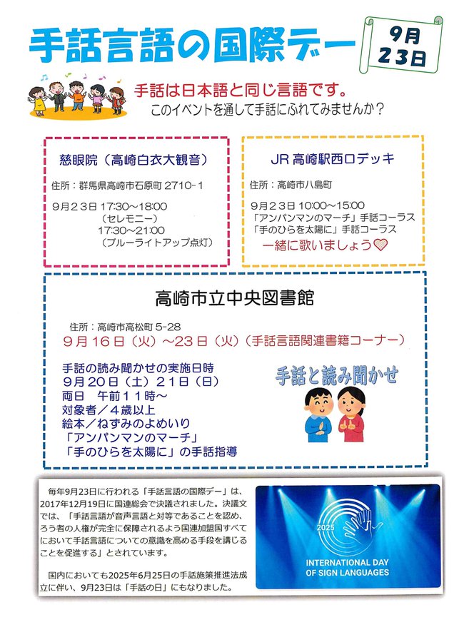 【9月23日は「手話言語の国際デー」です】高崎白衣大観音、西口ペデストリアンデッキ、中央図書館にて様々なイベントが行われます。ぜひお出かけください。https://city.takasaki.gunm..