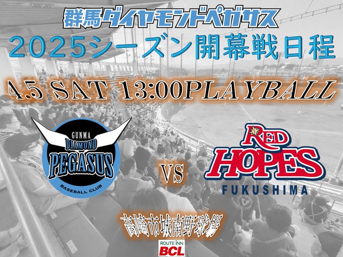 2025シーズン開幕戦日程のお知らせ【BCリーグ開幕戦・ホーム】4月5日㈯13:00PB(11:30開場予定)高崎市城南野球場《ビジター》4月6日㈰13:00PBヨーク開成山スタジアム対戦は両日ともに..