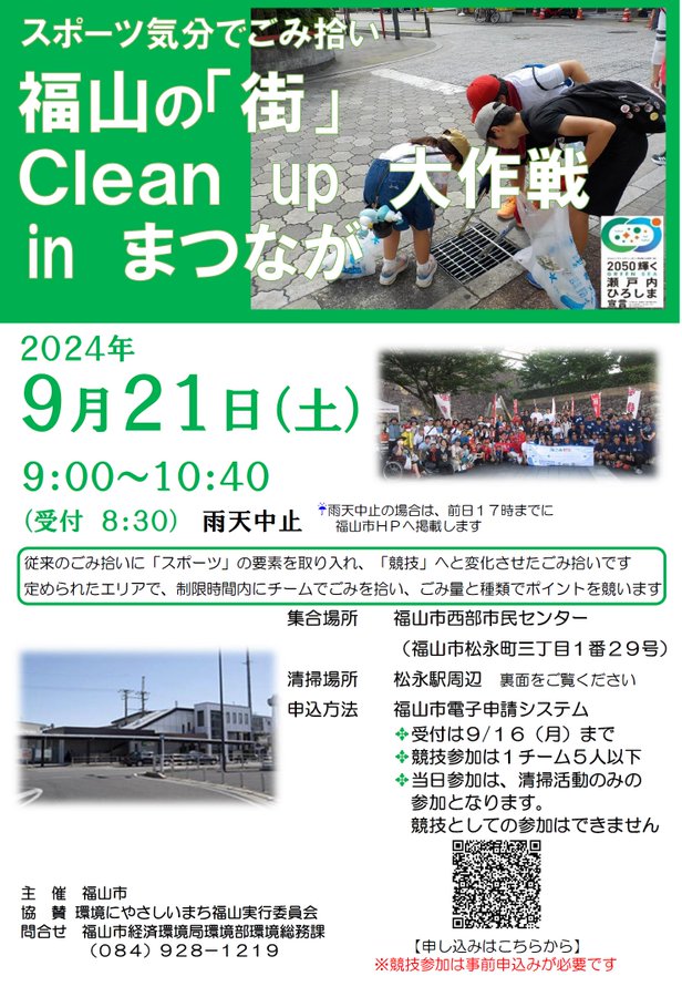 【イベントのお知らせ】9月21日(土)スポーツ気分でごみ拾い~#福山の『街』Cleanup大作戦inまつながを開催します今回は「まつなが駅周辺」で行いますご家族やご友人と一緒に参加しませんか?みなさん..