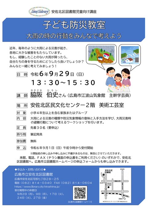 【いざというとき絶対役立つ】2024/9/29(日)、安佐北区民文化センターで『子ども防災教室~大雨の時の行動をみんなで考えよう~』が開催。小学4年生以上の子どもとその家族やグループが対象。要事前申し..