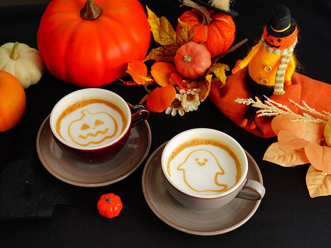 FVILLAGEHappyHalloween期間限定グルメ紹介KUBOTAAGRIFRONTCAFE・ハロウィンラテアートドリンク(カフェラテ・カプチーノ)おばけとかぼちゃランダムデザインのラテアート..