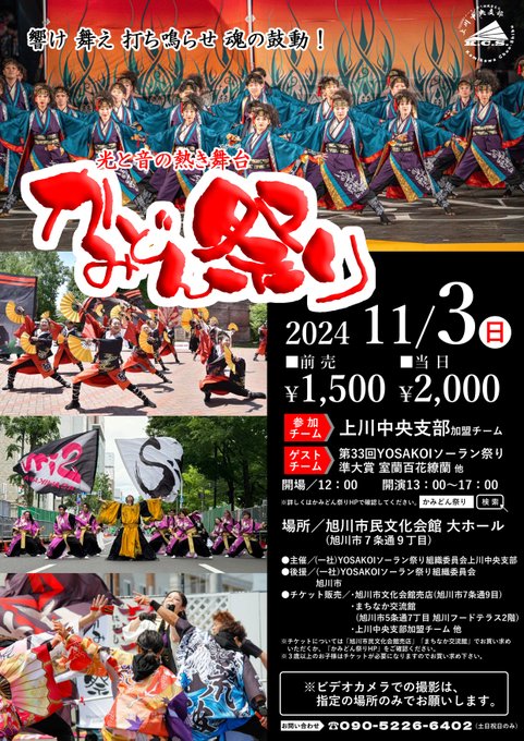 /チケット好評発売中!11月3日(日)はかみどん祭り\光と音が彩る、YOSAKOIインドアライブ「かみどん祭り」が4年ぶりに旭川市民会館で開催です26チームが出演!開場12:00/開演13:00▽詳細..