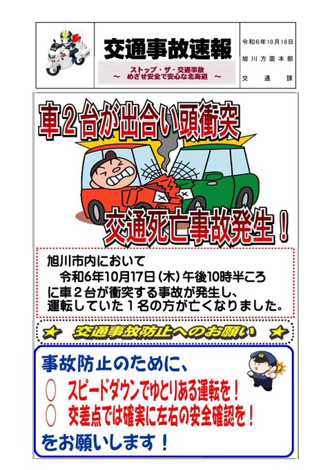 【旭川方面本部交通課からのお願い】10月17日午後10時半ころ、旭川市内で車2台が出合い頭に衝突し、1名の方が亡くなられました。事故防止のために・スピードダウンでゆとりある運転・交差点では確実に左右の..