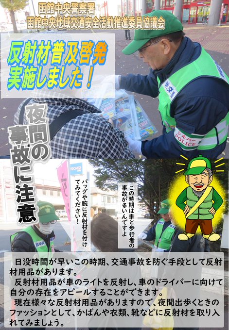 【#函館中央警察署#反射材普及啓発の実施】#日没時間が早いこの時期、車と歩行者の事故が多発します歩行者のみなさん、夜間外出の際は、明るい服装を心掛け、反射材を着用することで自分の存在を車のドライバーに..