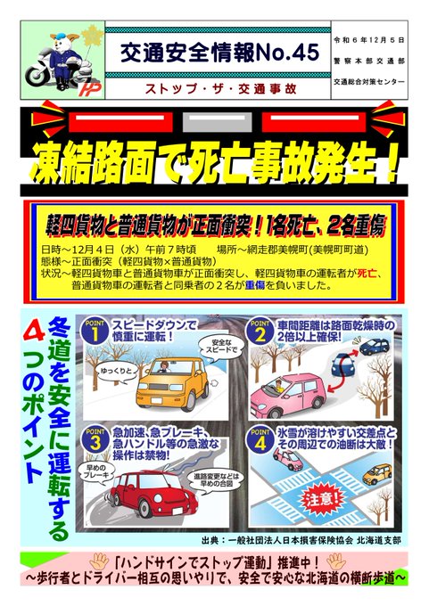 【#凍結路面で死亡事故!】12月4日(水)午前7時頃#美幌町で#死亡事故発生!冬道は・スピードダウンで慎重に運転・車間距離は乾燥路面時の2倍以上確保・急ブレーキ・急ハンドル等の急激な操作は禁物・氷雪が..
