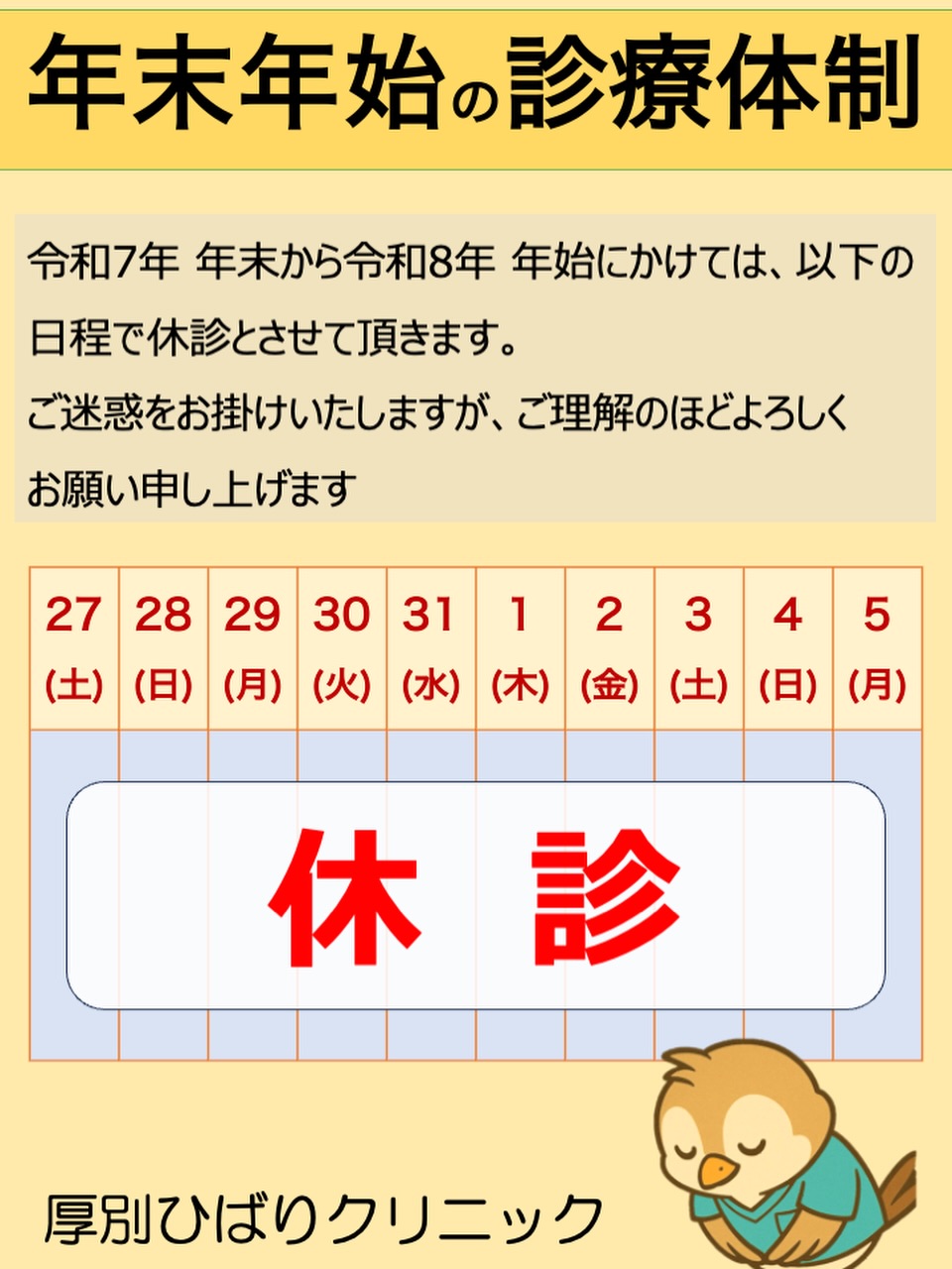年末年始は長い連休となります。どこにも出かけませんが、平日は時間がなくてなかなかできない体調調整、仕事、片付け、勉強をします。よろしくお願いします。#厚別ひばりクリニック#内科 #ペインクリニック内科..