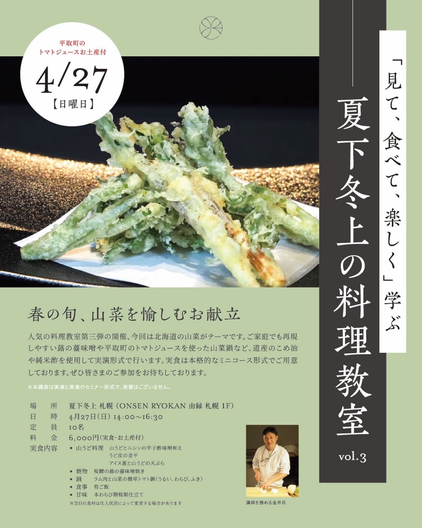ー「見て、食べて、楽しく」学ぶ 夏下冬上の料理教室Vol.3ーご好評いただいている料理教室の第三弾を開催いたします。今回のテーマは春の旬を愉しむ北海道の山菜。蕗の薹味噌焼き、平取町のトマトジュー..
