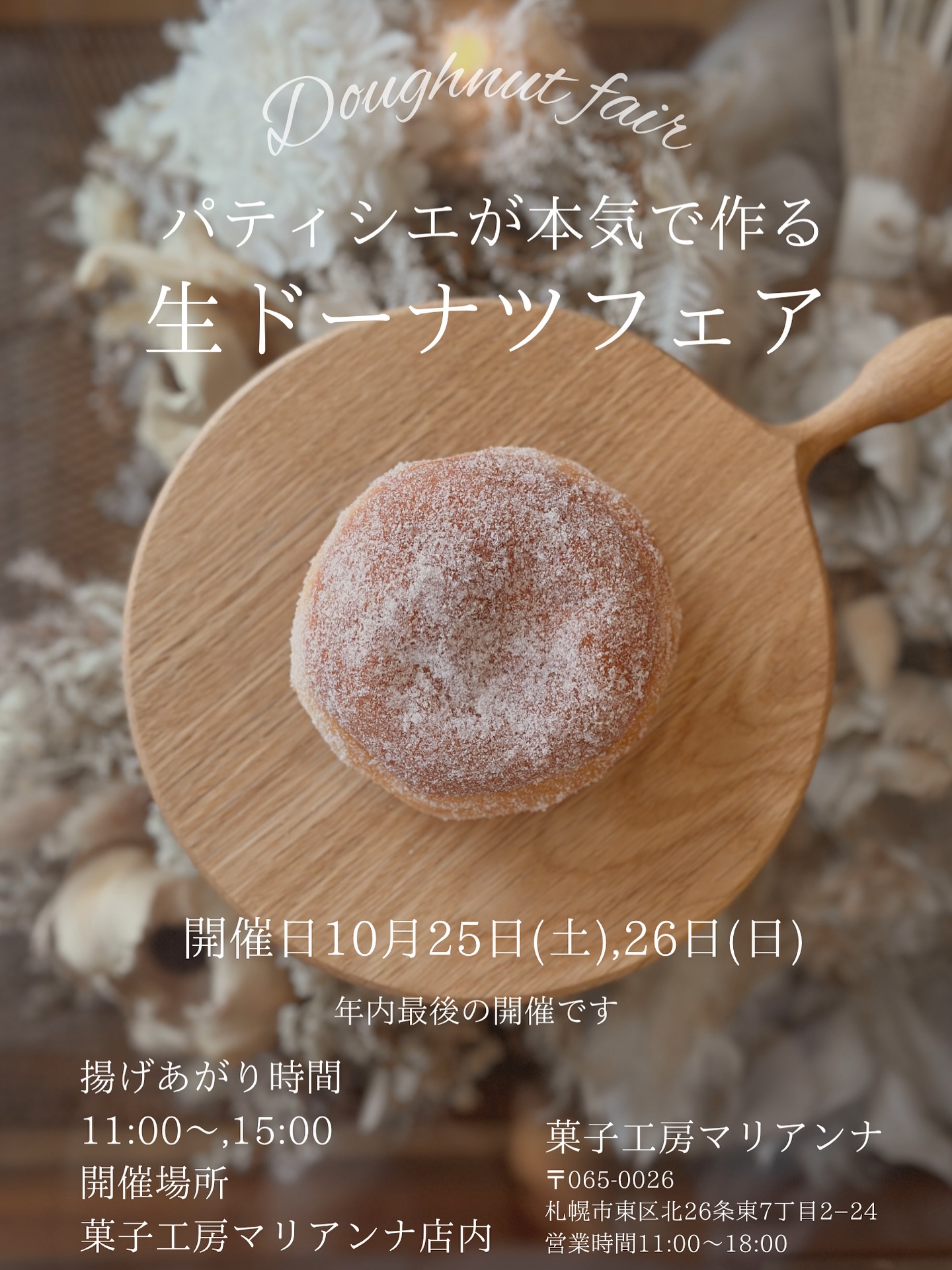 【年内最後の生ドーナツフェアとご予約開始】marianna.patisserie月に一度だけ開催しているパティシエが本気で作る生ドーナツフェア。10月25、26日の開催で年内最後となります。(11月、..
