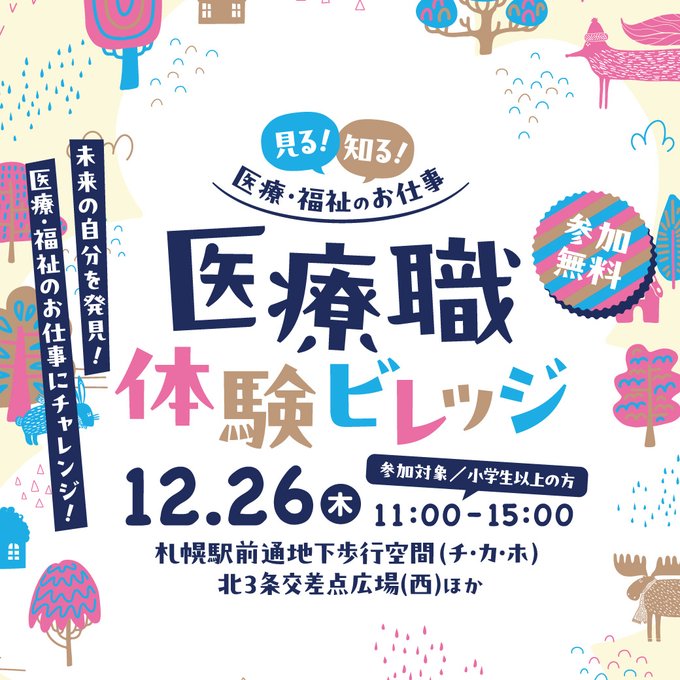 イベント開催(医療職体験ビレッジ)のお知らせ医療・福祉の職業について、体験をとおして幅広い世代の方に知ってもらうためのイベントを開催します!日時12/26(木)11:00~15:00場所札幌駅前通地下..