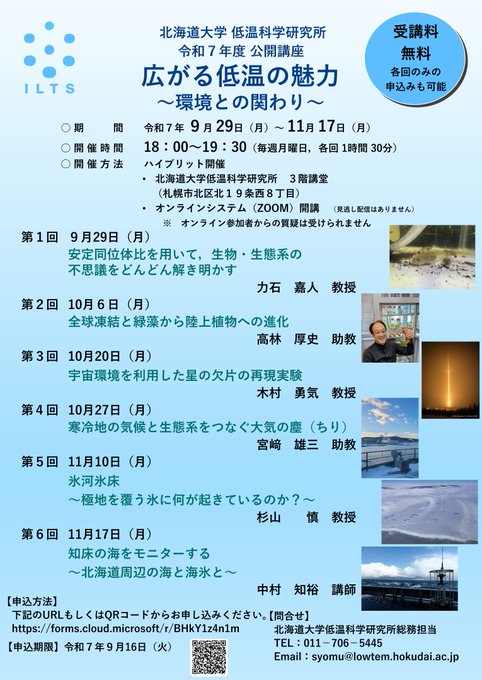 【イベント情報】【ハイブリッド開催】低温科学研究所公開講座「広がる低温の魅力〜環境との関わり〜」開催のお知らせ【低温科学研究所】(2025年9月29日(月)~11月17日(月)開催)詳細はこちらhtt..