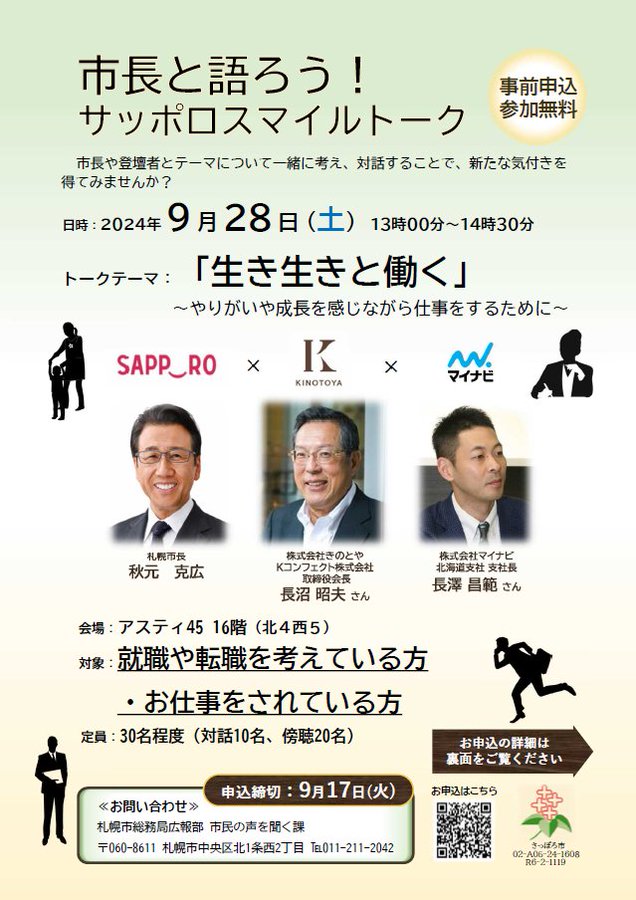 【総務局】「市長と語ろう!サッポロスマイルトーク」の参加者を募集します。「生き生きと働く」をテーマに、市長やゲストと意見交換しませんか。9/28(土)13時~14時30分、アスティ45で開催。定員30..