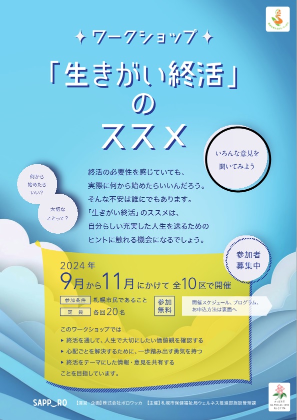 【保健福祉局】ワークショップ「『生きがい終活』のススメ」の参加者募集!この機会に自分の人生を振り返ってみませんか?9月から11月にかけて、各区で開催。札幌市民対象。定員:各回20人、参加無料。申し込み..
