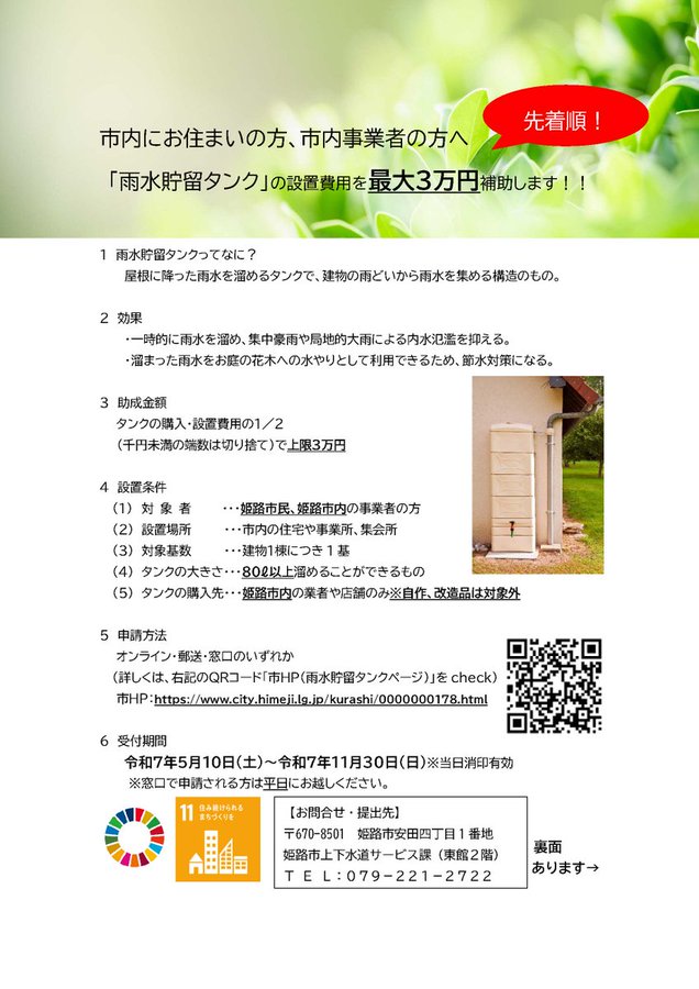 姫路市では 雨水貯留タンクの設置費用を助成しています 11月30日まで受付中 (先着順のため残りわずか) 申請方法はオンライン・郵送・窓口のいずれか 窓口で申請される場合は 姫路市役所東館2階上下水道サービス課へ 平日午前9時から午後5時までにお越しください 詳しくはツリーから