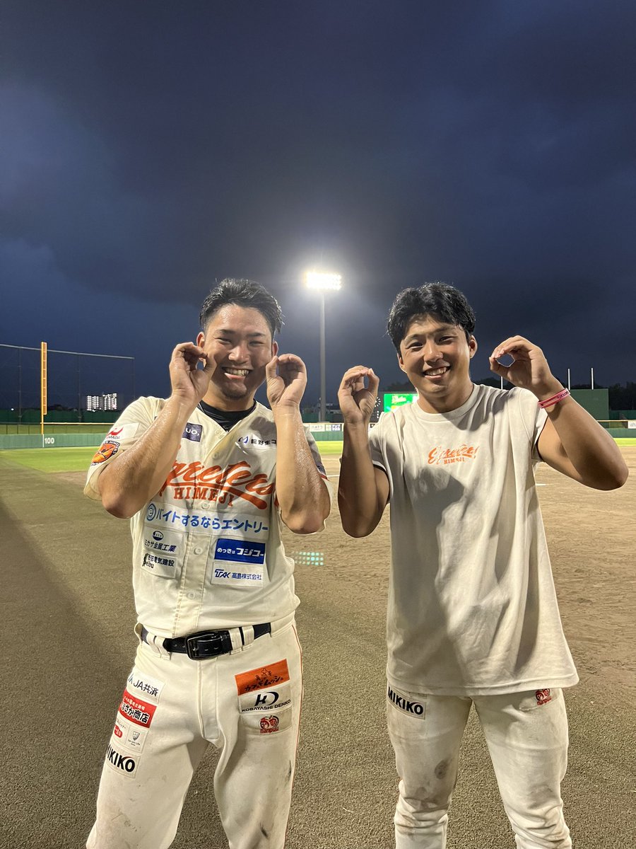 8/25(日)堺戦にて無失点のピッチングで切り抜けた#土屋風丸投手と#三浦弦氣投手試合後に2人でゼロポーズ!