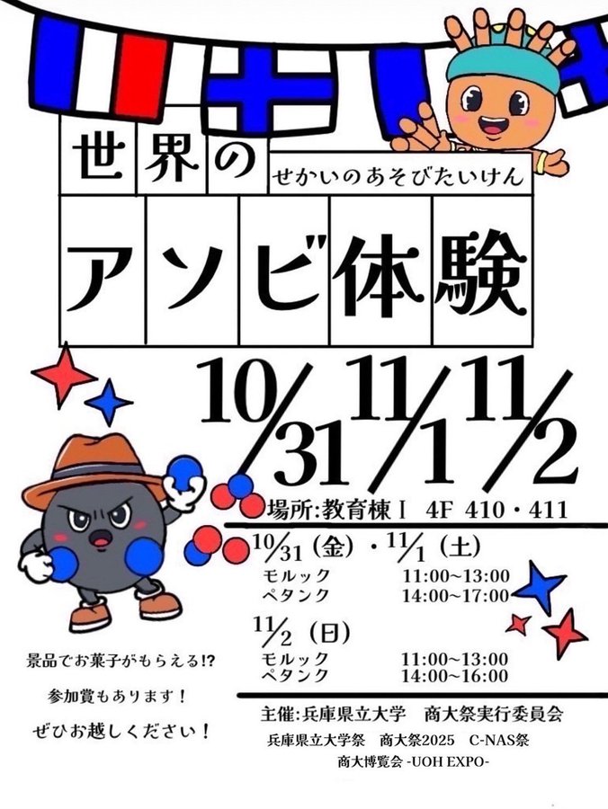今年の商大祭展示会では、世界のアソビ体験と題し、フィンランド発祥のモルックとフランス発祥のペタンクで遊ぶことができます!景品や参加賞でお菓子も用意しているのでぜひお越しください!#兵庫県立大学#兵庫県..