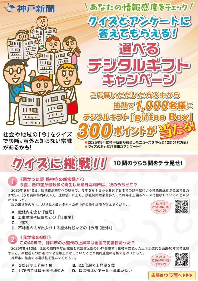 【参加無料】神戸新聞のクイズに答えてデジタルギフトを当てよう!抽選で1,000名様にデジタルギフト「gifteeBox」300ポイントが当たります。https://forms.gle/MAvpYpbM..