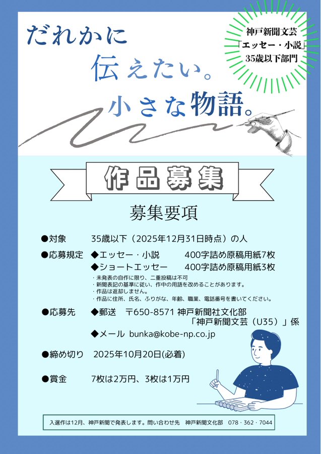だれかに伝えたい。小さな物語35歳以下の文芸コンクール。10月20日応募〆切です。賞金は7枚が2万円、3枚が1万円。自分の言葉で思いを綴ってみませんか?入選作は神戸新聞で発表させて頂きますお気軽にご応..