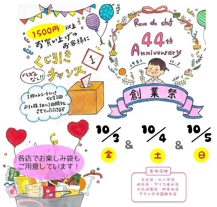 レーブドゥシェフは皆様のおかげで44周年🎂本日10/3より創業祭を開催致します各店舗1,500円以上のお買い上げでハズレなしのくじ引きに1回参加出来ます。1等 お菓子詰め合わせバスケット2等 ホールケ..