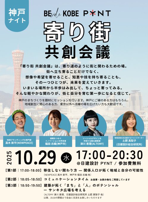 【BESIDEKOBE|都内イベント開催!】日建設計さんとのコラボ企画。サンキタ広場のリニューアルを手掛けた世界的建築家・津川恵理さんにも参加いただき神戸のまちづくりをテーマにセッションします。10/..