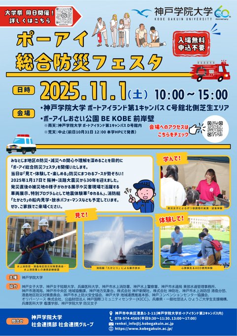 【11月1日(土)#ポーアイ総合防災フェスタ】神戸ポートアイランドで開催される「ポーアイ総合防災フェスタ」に#気象台も出展します。楽しい実験コーナーなどを準備してお待ちしています。ぜひ皆さまお越しくだ..