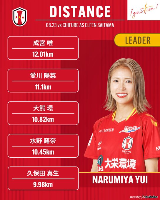|試合情報本日のEL埼玉戦のトラッキングデータランキングトップの走行距離を記録したのは#成宮唯選手#inackobe#INAC神戸#Ignition