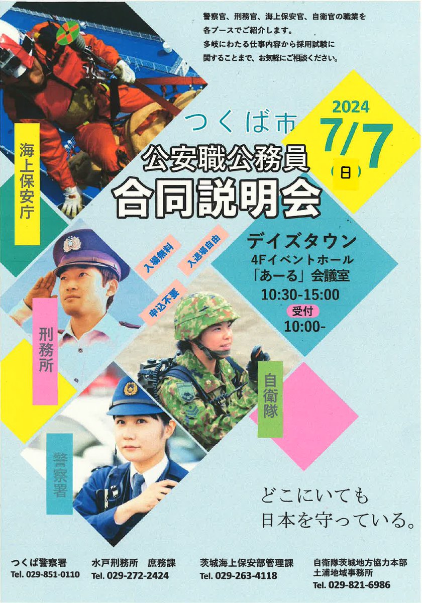 7月7日(日)10時30分~15時、デイズタウンつくば4Fイベントホール「あーる」にて、つくば市公安職公務員合同説明会を開催します。警察、自衛隊、刑務官、海上保安庁!申込不要、入場無料、服装自由。少し..