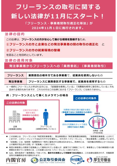 フリーランスの取引に関する新しい法律が11月1日にスタートします!フリーランスの方、フリーランスと取引のある企業の方は内容をご確認ください。詳細は↓https://jsite.mhlw.go.jp/i..