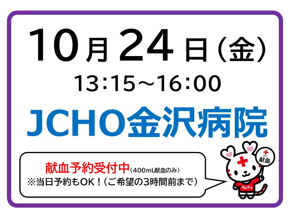 いつも献血にご協力頂きありがとうございます 10月24日(金)に以下の会場へ献血バスが訪問します #JCHO金沢病院(受付13:15~16:00) 皆さまのご協力をお待ちしています! #献血 #石川