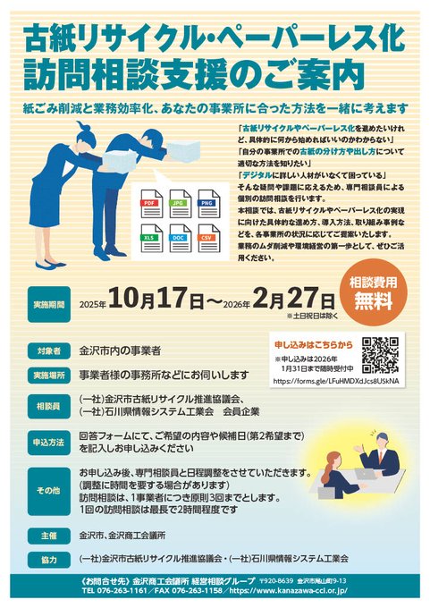 古紙リサイクルやペーパーレス化の導入を検討されている市内事業者の皆さまを対象に訪問相談支援を実施します。専門相談員が事業者様の事務所などにお伺いし、あなたの事業所に合った方法を一緒に考えます。#金沢市..