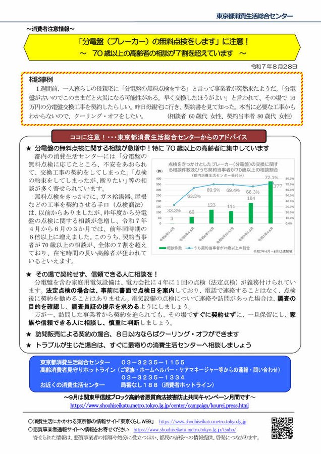 【分電盤(ブレーカー)の無料点検をしますに注意】 #分電盤 の #無料点検 に関する相談が急増中!特に70歳以上の #高齢者 に集中しています。その場で契約せず、信頼できる人に #相談 を!