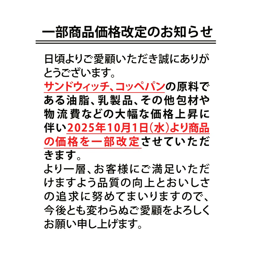告知ですおはようございますマルジューです日頃よりご愛顧いただき誠にありがとうございますサンドウィッチ、コッペパンの原料である油脂、乳製品、その他包材や物流費などの大幅な価格上昇に伴い2025年10月1..