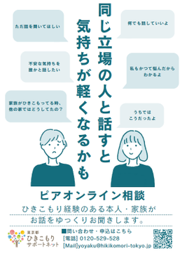 「同じ立場の人と話すと気持ちが軽くなるかも」ひきこもり経験のある本人・家族がお話をゆっくりお聞きします。東京都ひきこもりサポートネットのピアオンライン相談問い合わせ・申込はこちらはこちら⇛https:..