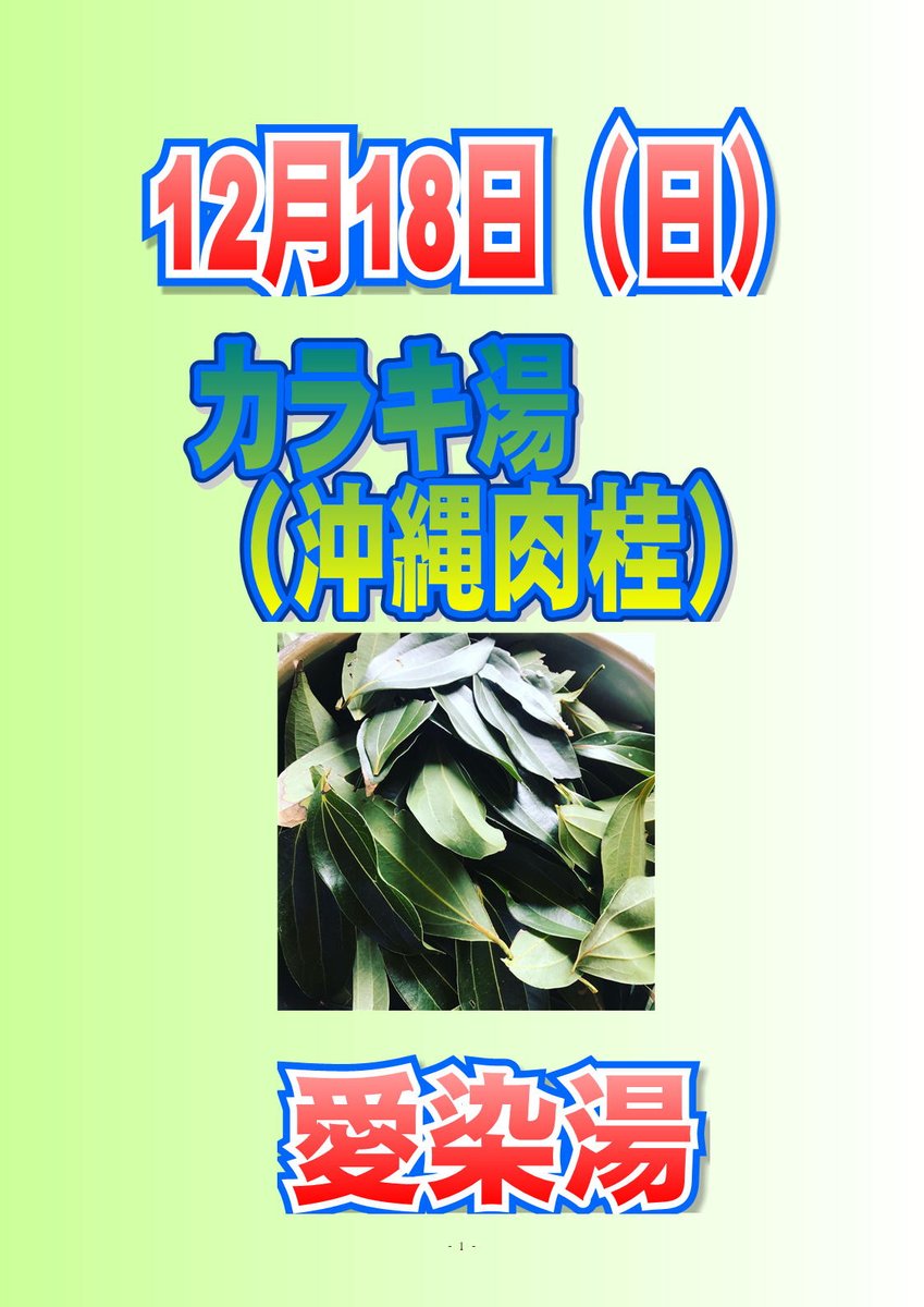 おはようございます。愛染湯は本日は日曜日ですので、朝8時から午後11時迄(女性は10時30分)営業しています。今日はルイボスティー(アフリカ茶)湯を行っています。露天風呂の浴槽が赤く染まっています。年末年始の予定を貼りましたので、ご参照ください。