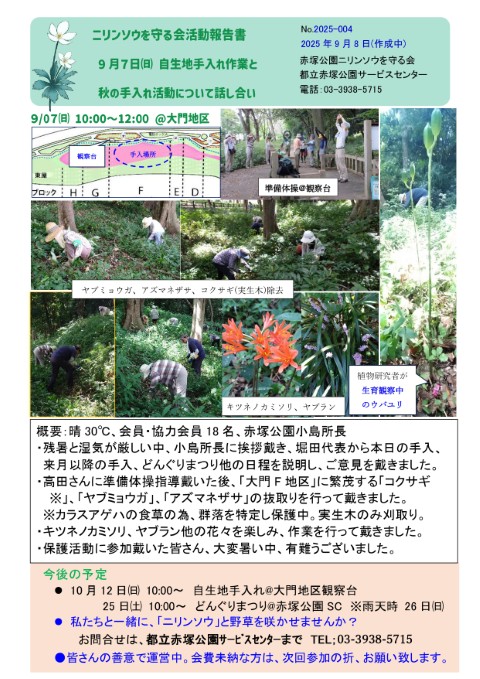 エコポリスセンターです!かんきょう観察地域自主活動グループ赤塚公園ニリンソウを守る会の活動報告書(20250908)を更新しました。https://itbs-ecopo.jp/wp-content/u..