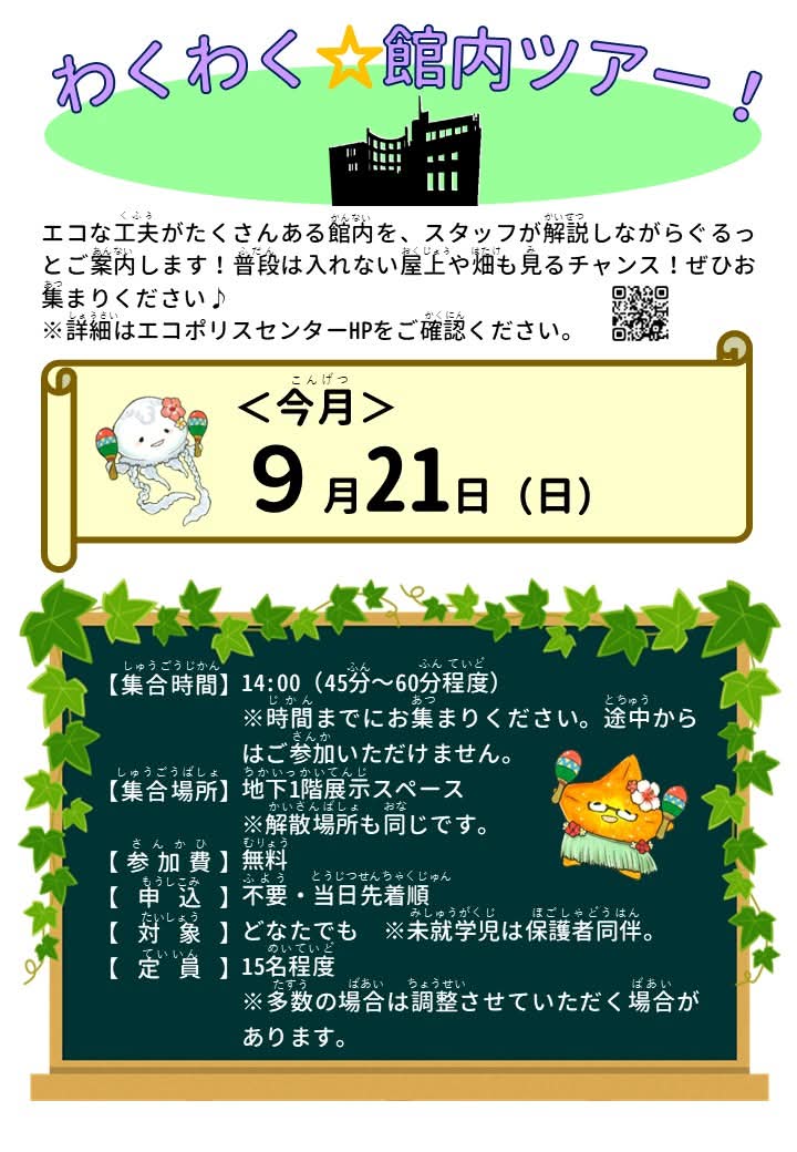 #エコポリスセンターです!9/21(日)14時から事前申込不要、先着順のわくわく☆館内ツアーを開催!集合は地下1階。約40分です。普段は入れない地下2階やビオトープなどを見るチャンス!エコに作られてい..