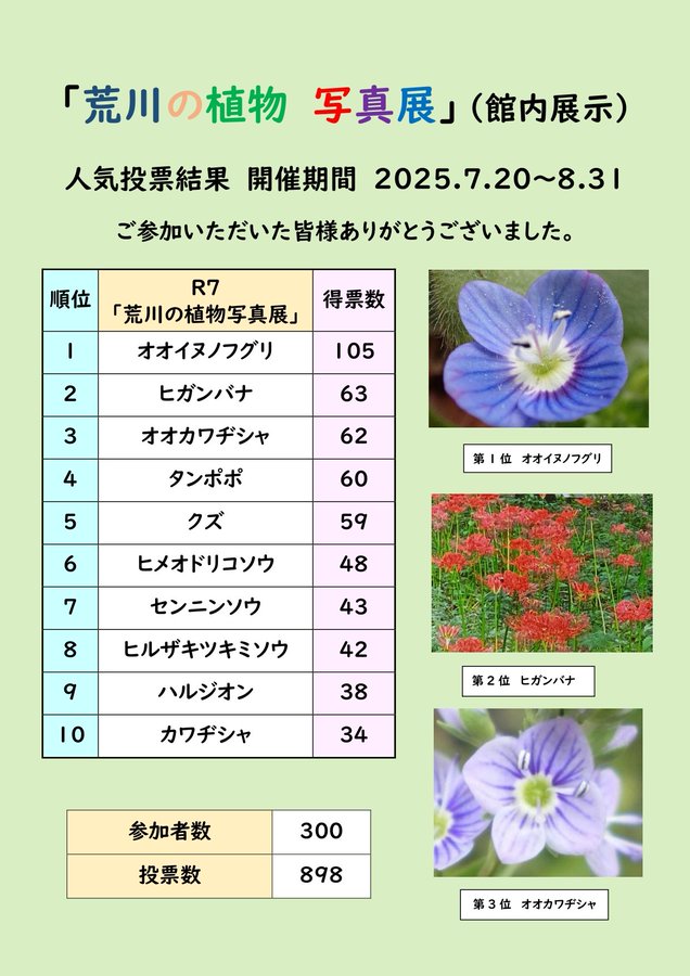 #エコポリスセンターです!「荒川の植物写真展~四季~」(2025年7月20日~8月31日)で行いました荒川の植物写真展の人気投票結果を発表いたします!参加していただいた皆さまありがとうございました。h..