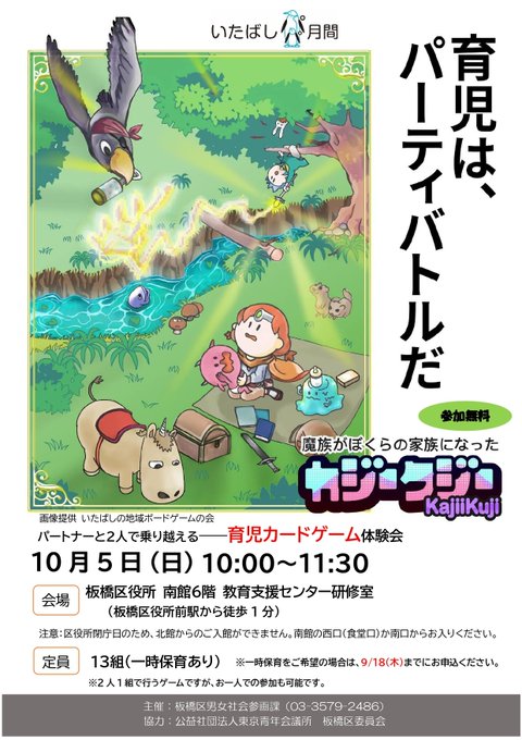 【育児カードゲーム「カジークジー」体験会参加者募集】プレイヤー2人が勇者と賢者になり、次々と襲いかかる家庭や仕事のトラブルを解決していく対話型の協力ゲームです。パートナーと協力し合ってクリアをめざしま..