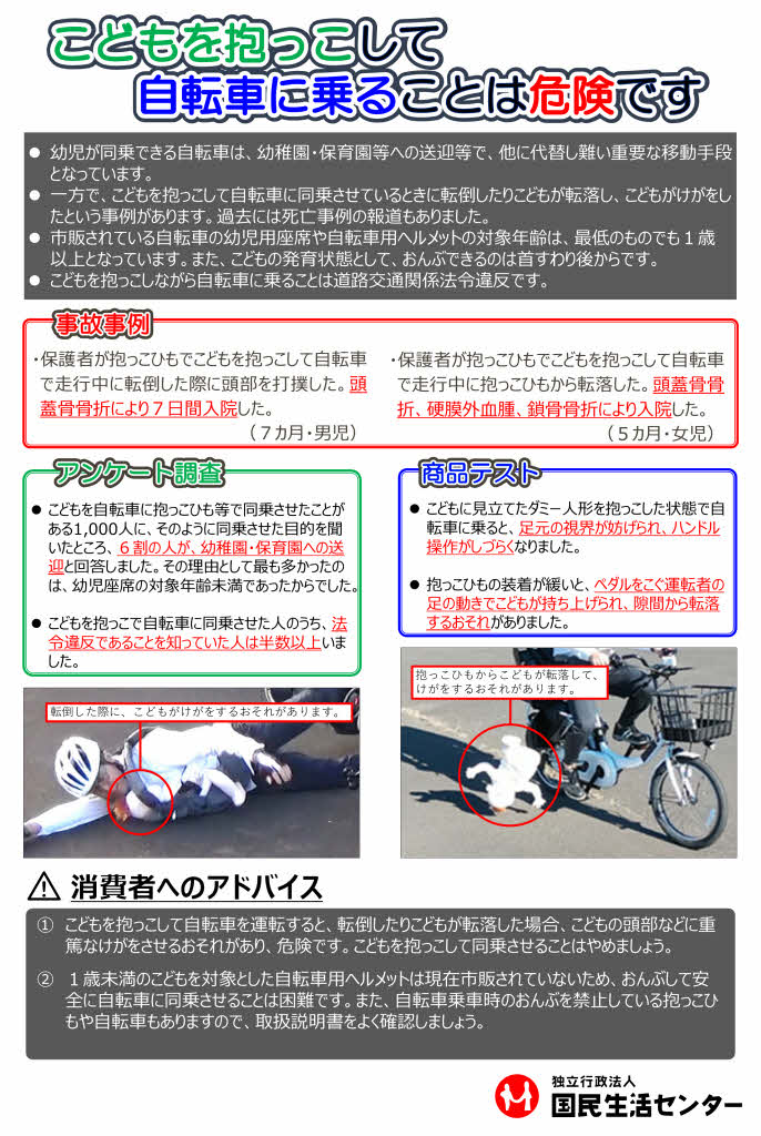 【子ども安全情報 こどもを抱っこして自転車に乗ることは危険です】子供を抱っこして自転車に乗ると「ハンドルを大きく切れない」「足元が見えない」など危険がたくさん。抱っこ運転の再現動画は国民生活センターH..