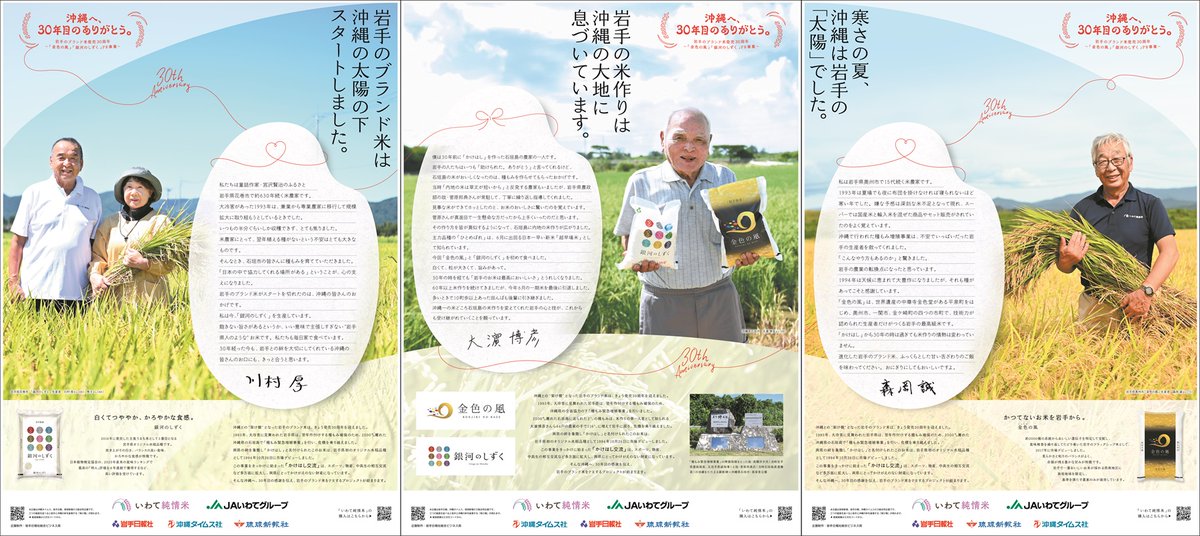 きょうは30年前、岩手のブランド米第1号の「かけはし」が発売された日。本日の岩手日報、沖縄タイムス、琉球新報に広告を掲載しました。三つの紙面を横に並べると、アーチ状の「架け橋」が現れます。https:..