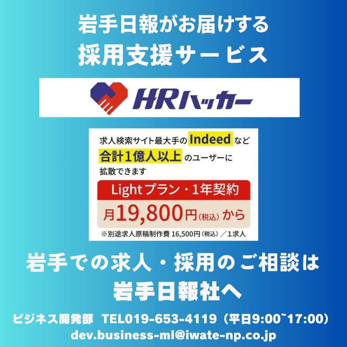 企業の採用担当者の皆さま、こんな悩み抱えていませんか?●企業説明会に学生が来ない●求人を出しても応募が来ないetc...そのお悩みを岩手日報社が一緒に考えます。“本当に出会いたい人材”に情報を届けるサ..