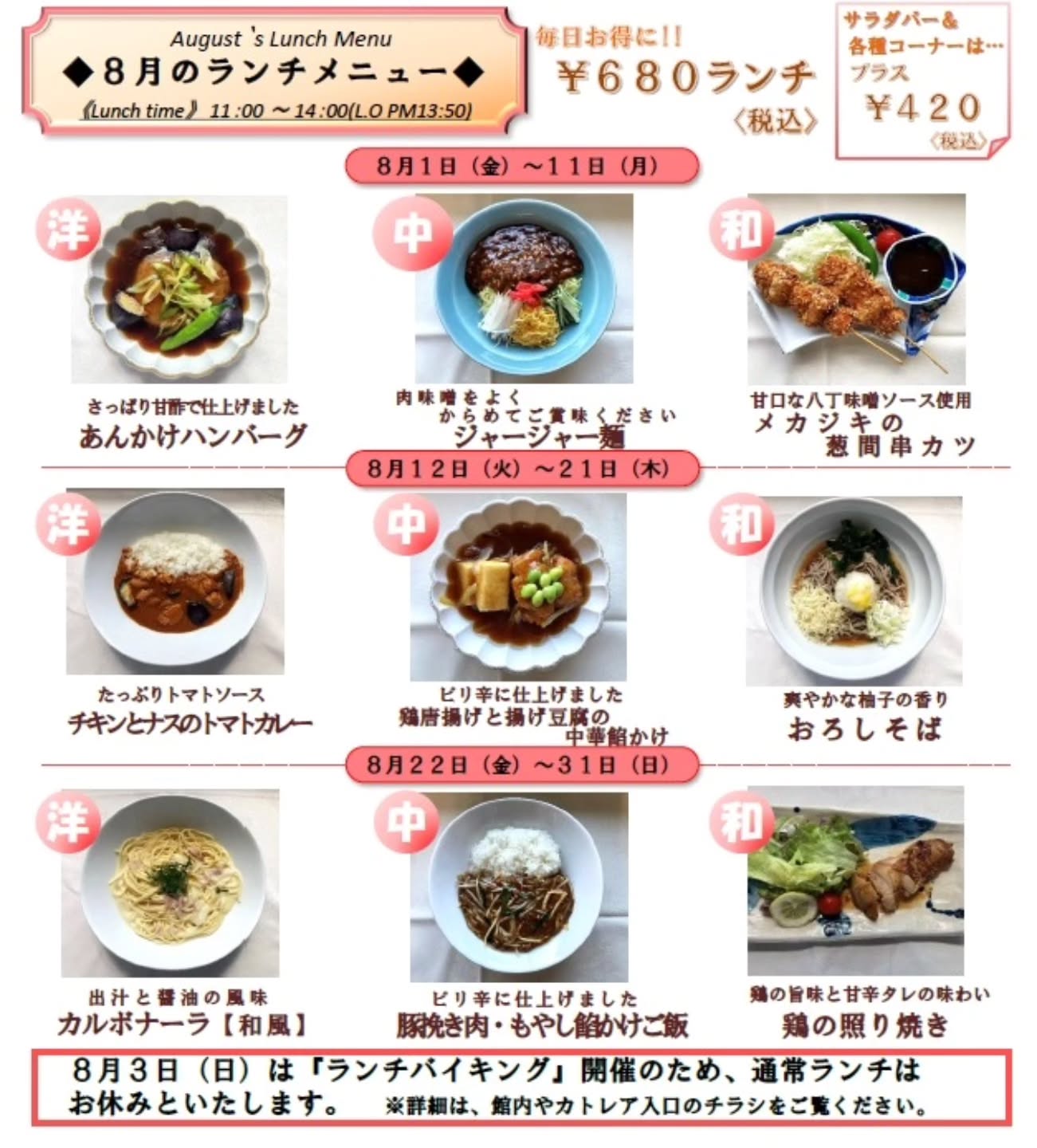 レストラン【カトレア】8月のランチメニューをご紹介🎵#岩手県#盛岡市#志家町#サンセール盛岡#ランチ#盛岡ランチ#ランチバイキング#ご会合#ご宴会#合宿プランあります#駐車場あります