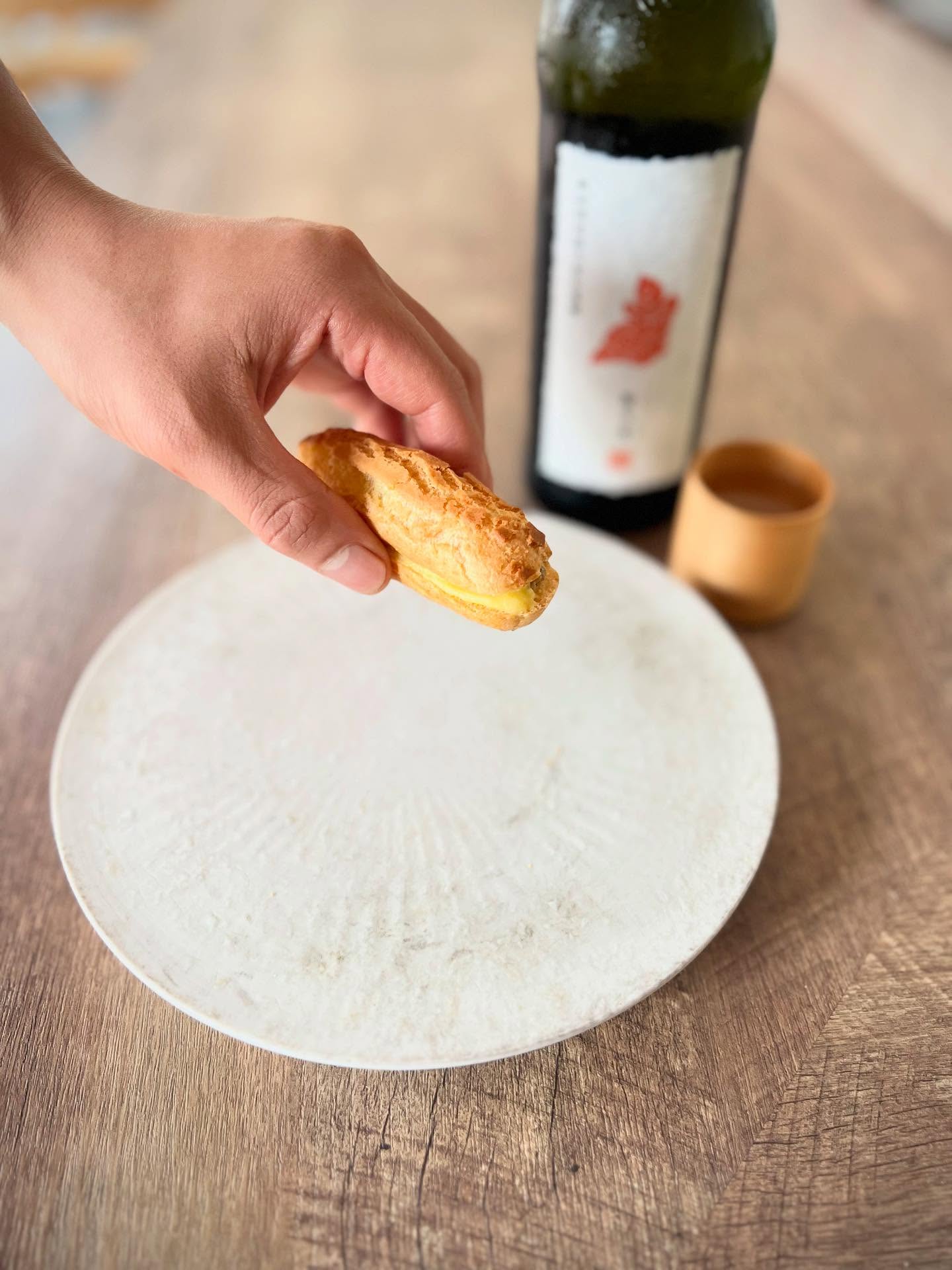 エクレアホロホロ鳥の白レバームースをカラメリゼkouitirouishikuroとうもろこし おおもののピューレルバーブの甘酸っぱいコンフィチュールuruoihitotoseアルコールペアリング新政の..