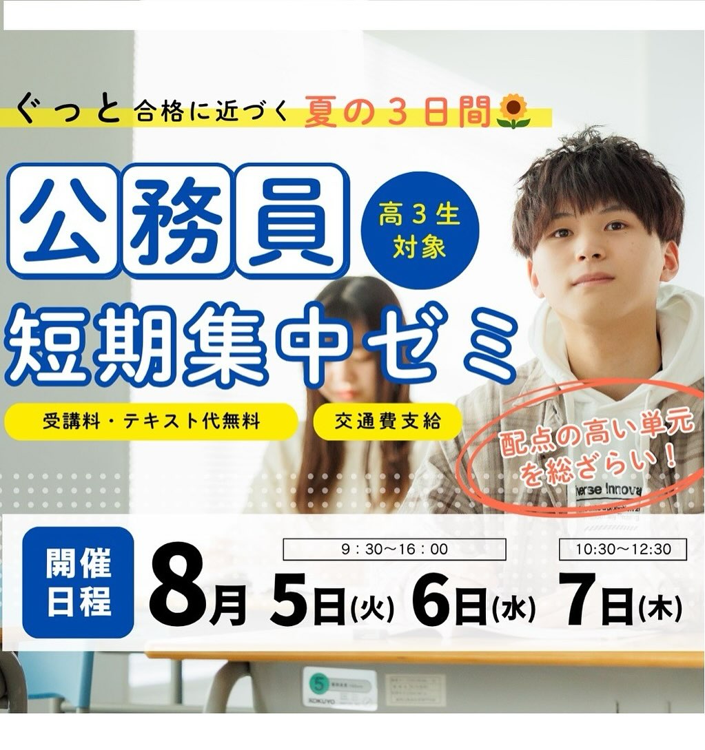 公務員試験の勉強が不安なら迷わず参加しよう!<高校3年生対象>✈️公務員短期集中ゼミ8/5(火)~8/7(木)9:30~16:00※8/7のみ10:30~12:30持ち物▶筆記用具・昼食※8/7は不要..