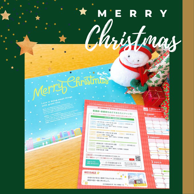 MerryChristmas受験生の方へ「Xmasカード(受験案内)」を発送しました応援メッセージ付きです岩手保健医療大学は、看護師・保健師を志すあなたを応援しています入試情報・資料請求こちらhttp..