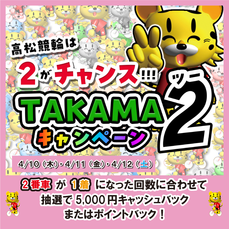 高松競輪は2がチャンス!#TAKAMA2キャンペーン4/10~12高松競輪『モーニング競輪CMS杯争奪戦(FⅡ)』の車券を、インターネット投票でご購入されたお客様が対象2番車の1着入着回数に応じて抽選..